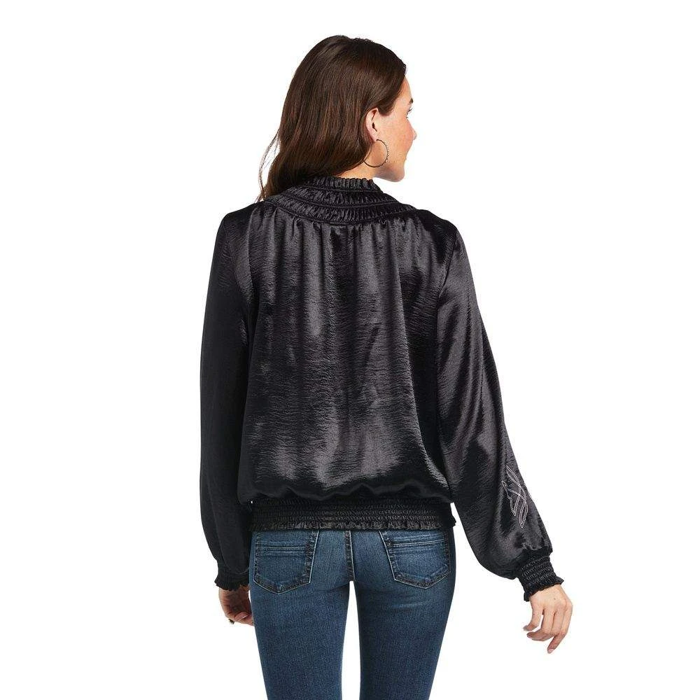 This Ariat Satin Bomber Jacket will take any outfit to the next level! The beautiful boot stitch pattern is the perfect embellishment to add a touch of western flare.