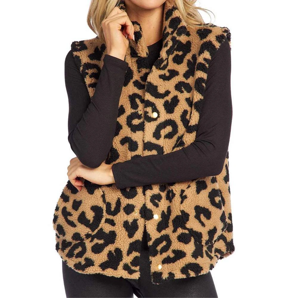 Sherpa vest features front pockets and gold metal snap front closure. Measures approximately 25″ from shoulder to hem on size small.