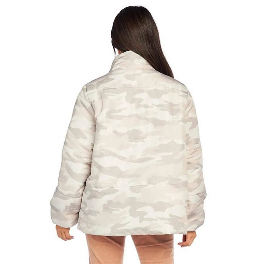 Lined printed puffer jacket with standing collar features front zipper closure and side pockets